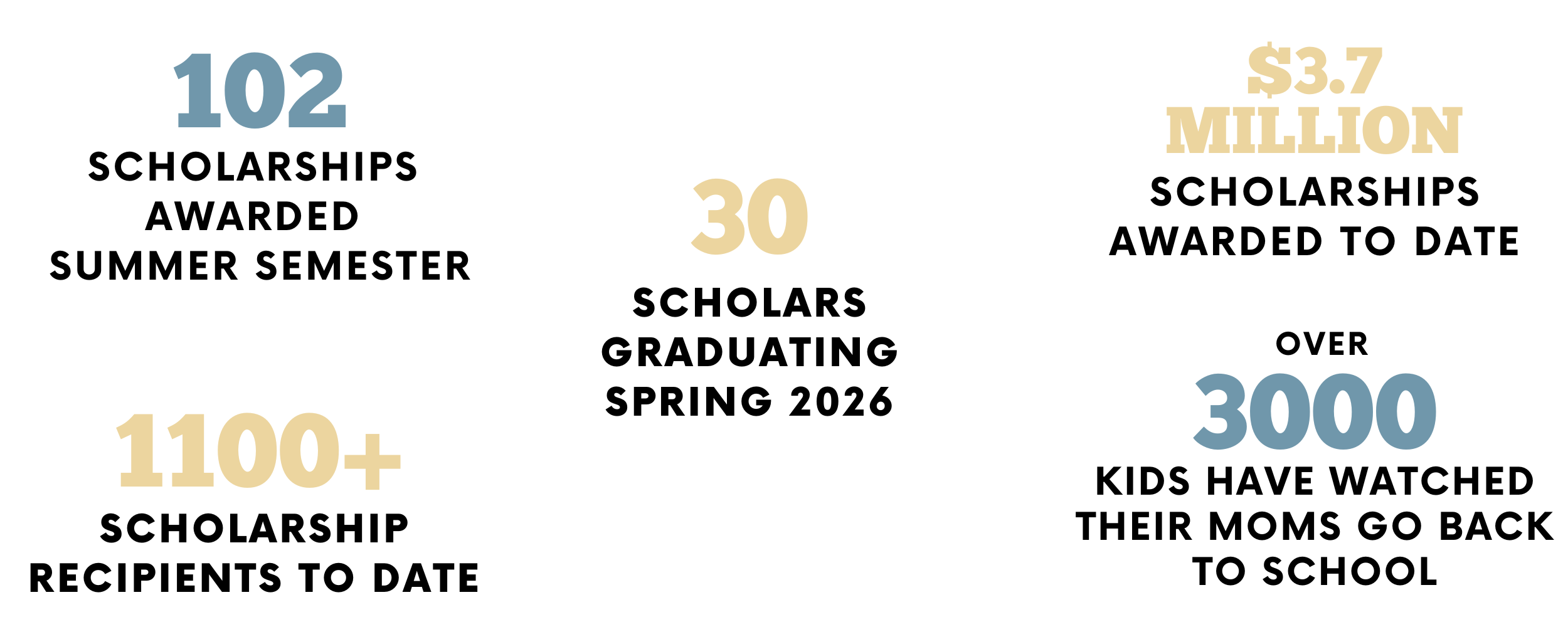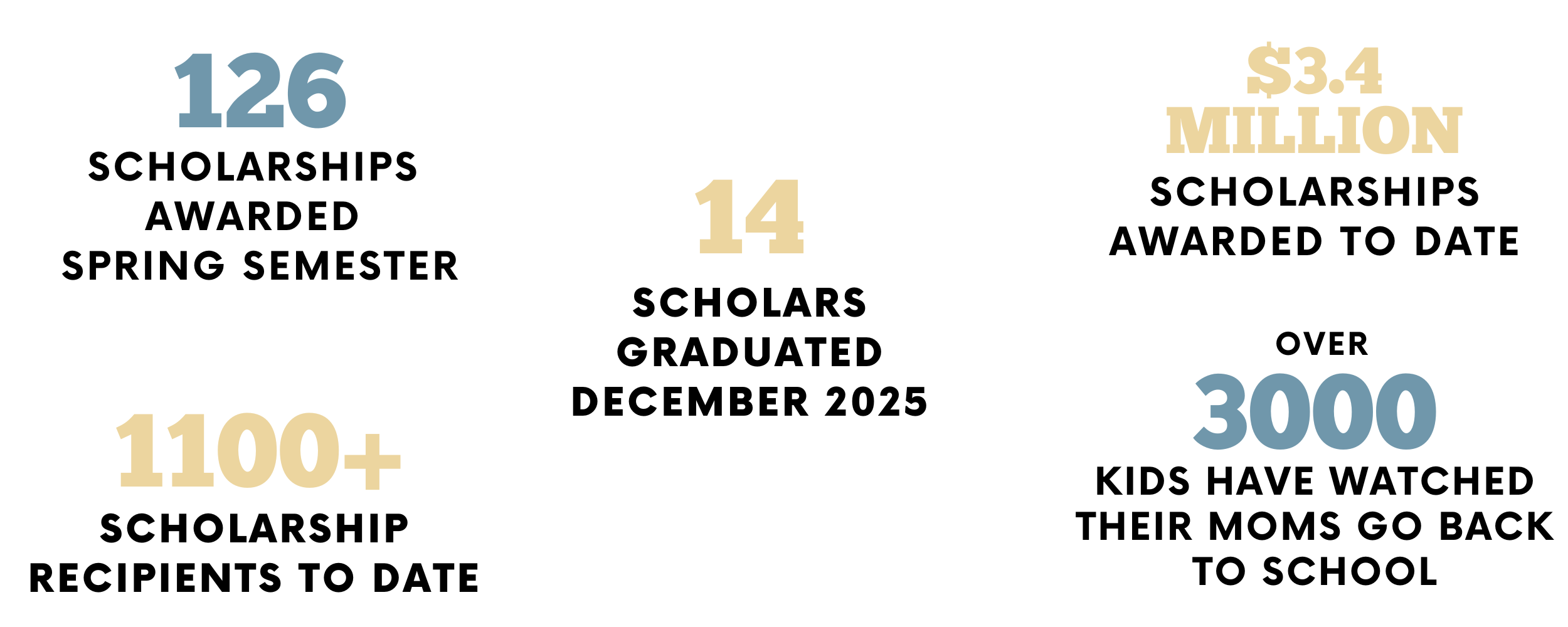 Our mission is to provide scholarships that enable single mothers to receive the education and skills training they need to fulfill their educational goals, enter the workforce, and support their children.